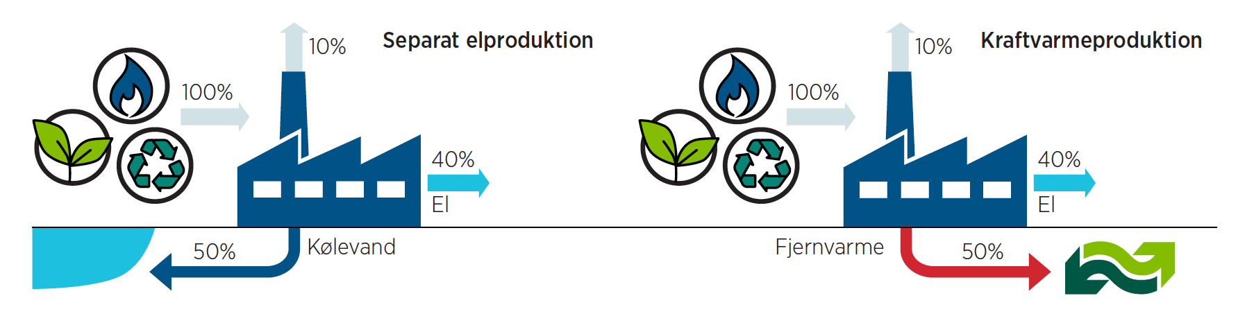 På et traditionelt kraftværk omsættes ca. 40% af den tilførte energi til el. Resten af energien udnyttes ikke og forsvinder med kølevandet ud i havet og op i den blå luft. Et kraftvarmeværk virker på samme måde, men her bliver dampen i stedet kølet med returvand fra fjernvarmenettet, og energien udnyttes dermed i fjernvarmesystemet.